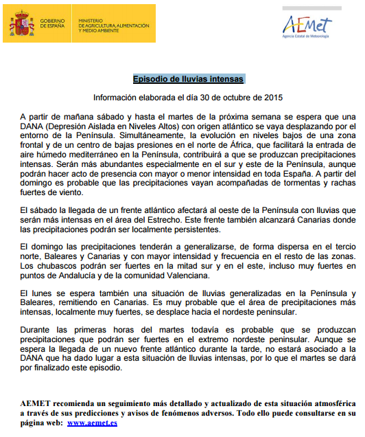 Atención a la nota informativa sobre el episodio de lluvias torrenciales para próximos días