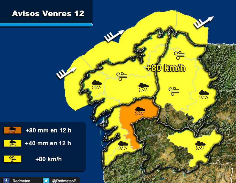 (⚠) MAPA DE AVISOS PARA MAÑA: OLLO coa CHUVIA no interior de , aviso LARANXA por máis de 80 mm en 12h!