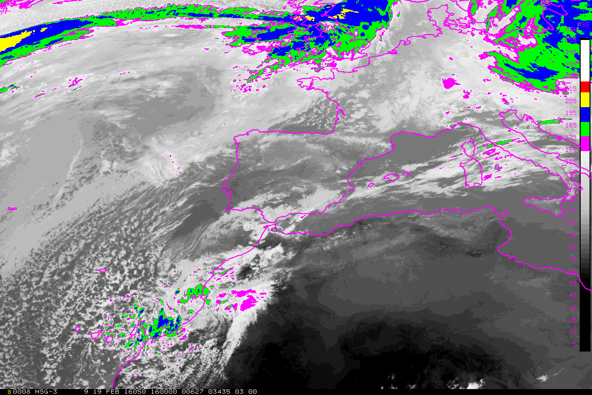 Imagen IR realzada donde se observa la nubosidad asociada a la depresión sobre Canarias.
