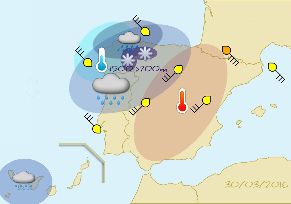 Grandes contrastes nas masas de aire os que teremos mañá na Península! Aire frío no oeste. Aire cálido no leste