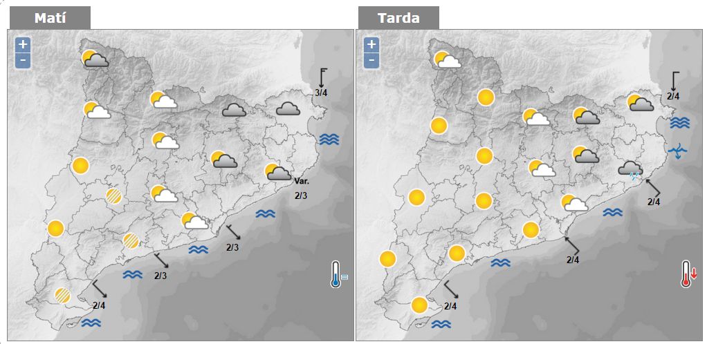 Diumenge marcat per la nuvolositat amb algun ruixat al NE al centre del dia. Més: