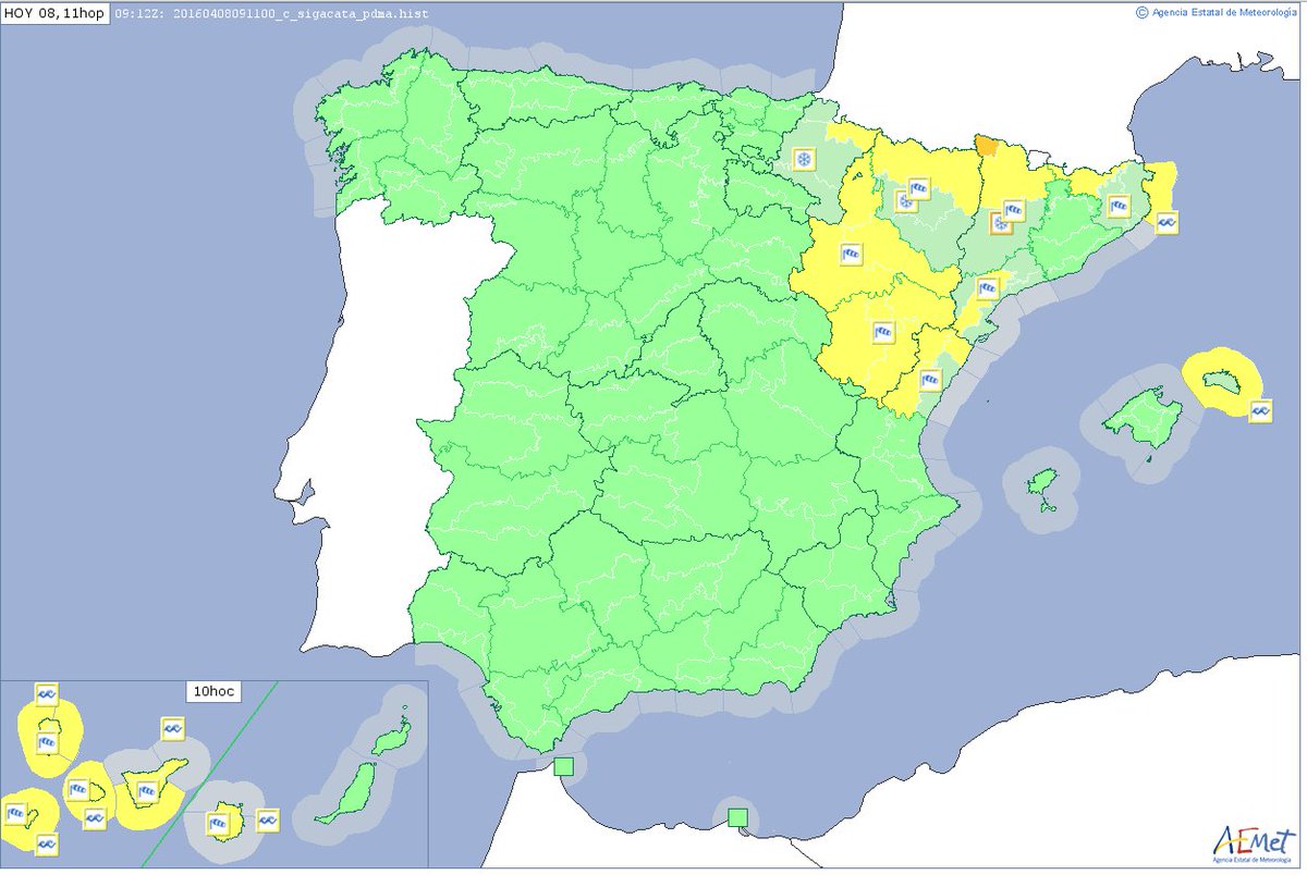 Mapa de para hoy. Amarillos por y en Canarias. Naranja en el Valle de Arán por