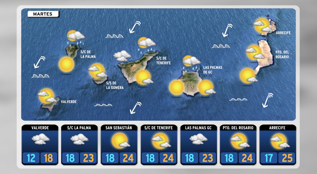 Martes 17: Abundante nubosidad N-E islas relieve, nubes se situarán a menos 1400 m. En S-W y cumbres tiempo soleado.