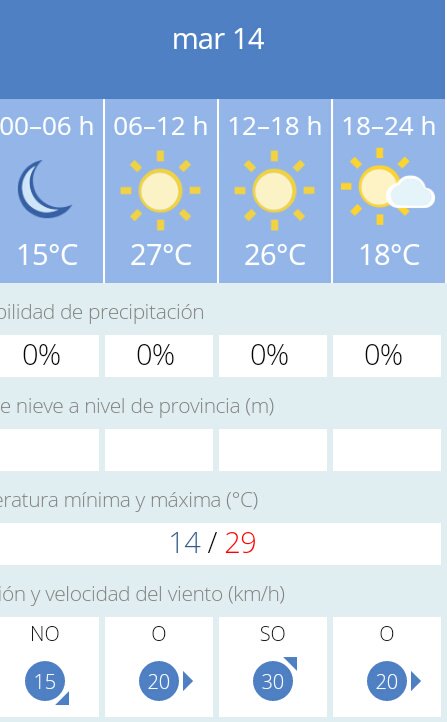 Hoy Martes amanecemos con un dia con intervalos nubosos y temperaturas entre 14 y 29 ºC. Buenos dias.