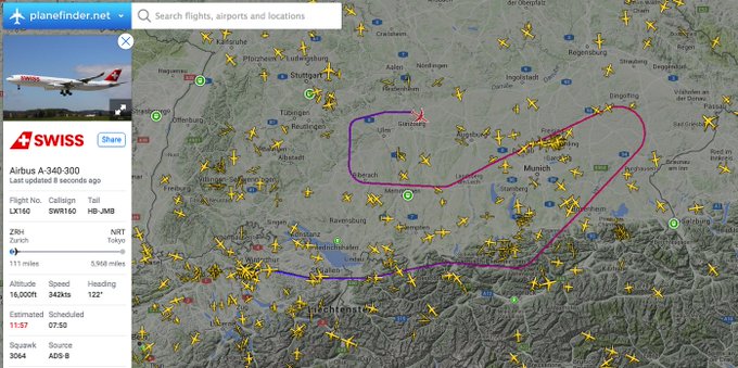 Swiss #LX160 to Tokyo is circling after departure from Zurich