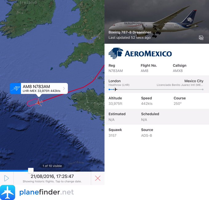 LIVE: Aeromexico #AM8 has been circling off the coast of France-now diverting via @planefinder pic.twitter.com/H1qMVIq3y3 - @NikPhillips666