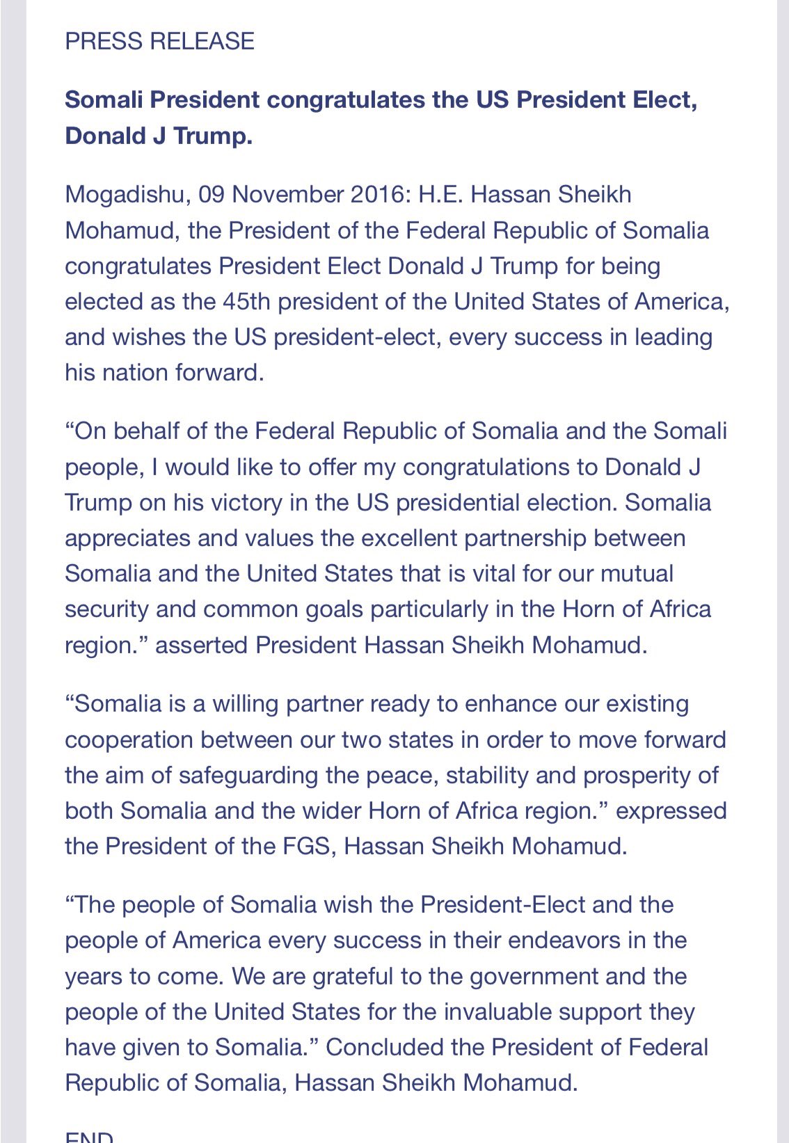 Statement: President of Somalia Hassan Sheikh Mohamud sends congratulations to Donald Trump - @DalsanFM